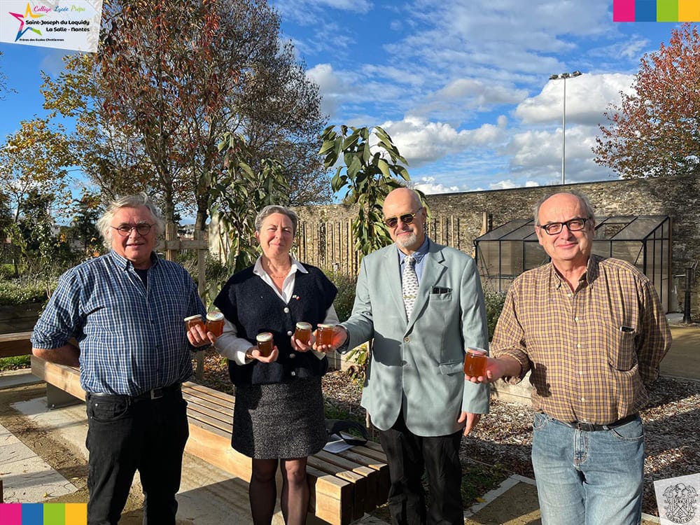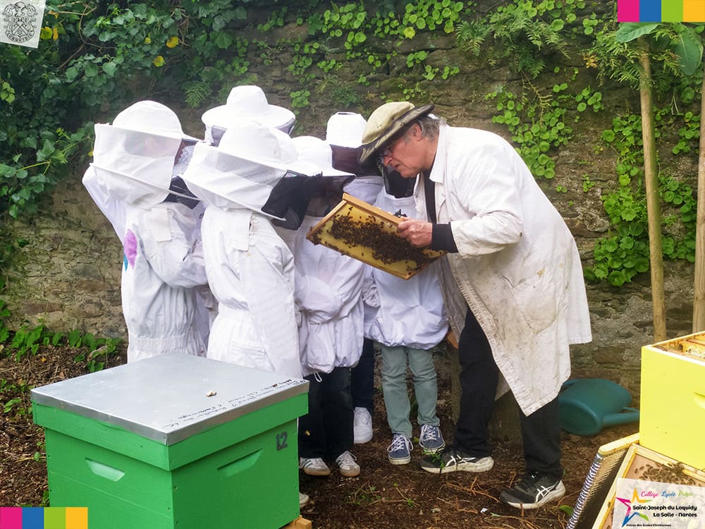 Depuis 2008, cette collaboration, inscrite dans le cadre de notre label E3D, offre aux élèves une immersion au cœur de l’apiculture grâce à nos 5 ruches installées dans le parc du Loquidy.